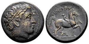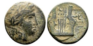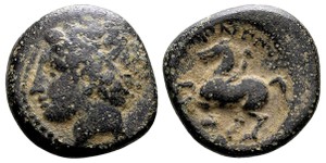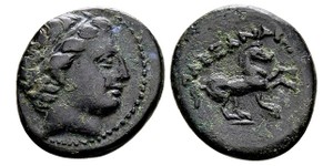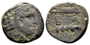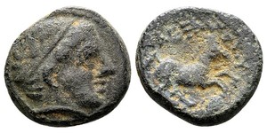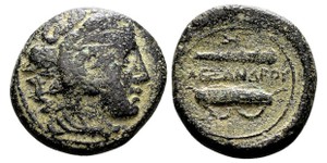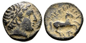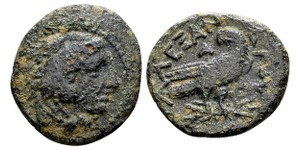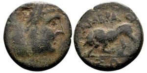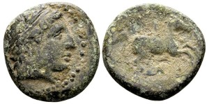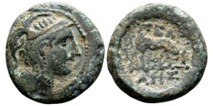 Pseudo-autonomous, ca. 187-31 BC. Æ18, 7.12 g. Helmeted head of Athena right / ΠΕΛ ΛΗΣ bull grazing right; below: monogr ...