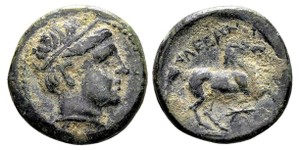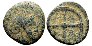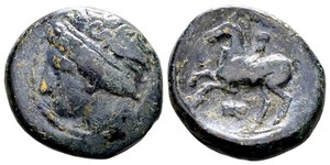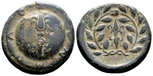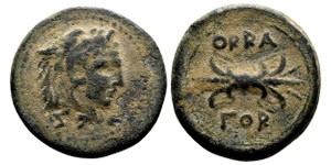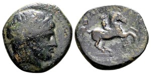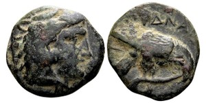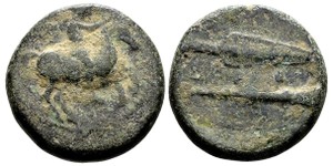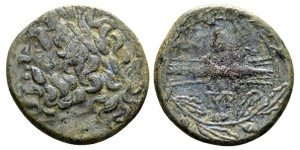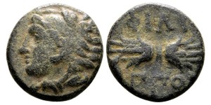 Ca. 210-150 BC. Æ semis(?), 10.2 g. Head of young Heracles right / winged thunderbolt; above and below: ORRA ΓOR. SNG Co ...