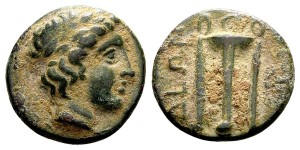 Olynthos, ca. 360-348 B.C. Æ12, 1.97 g. Laureate head of Apollo right / [XAΛKI] ΔEΩN tripod. SNG ANS 561. Good style, at ...