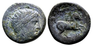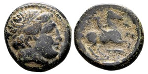 Uncertain mint in Macedon, 315-295 BC. Æ18, 6.32 g. Head of Apollo right / ΦIΛIΠΠOY youth on horseback right; below: A. ...