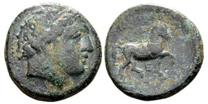 Uncertain mint in Macedon, 336-323 BC. Æ16, 4.02 g. Head of Apollo right / ΑΛEΞΑΝΔΡΟΥ horse rearing right; below: A. SNG ...