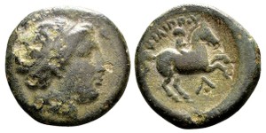 Uncertain mint in Macedon, 315-295 BC. Æ20, 9.24 g. Head of Apollo right / ΦIΛIΠΠOY youth on horseback right; below: cor ...