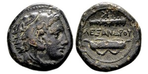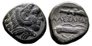 Uncertain mint in Macedon, 336-323 BC. Æ17, 6.22 g. Head of young Herakles right, wearing lion skin / ΑΛEΞΑΝΔΡΟΥ bow, q ...