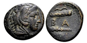 Uncertain mint in Macedon, 325-310 BC. Æ18, 6.4 g. Head of young Herakles right, wearing lion skin / B Α bow, quiver, an ...