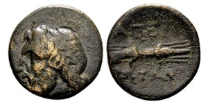 Ca. 356-351 BC. Æ hemiobol, 3.95 g. Head of Dionysos wearing ivy-wreath right / [K]ETPIΠΟPIO[Σ] kantharos; to left: thyr ...