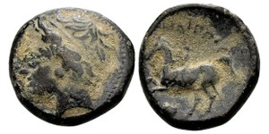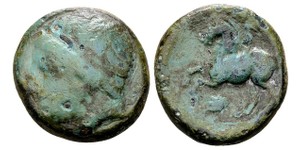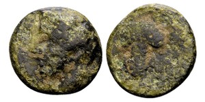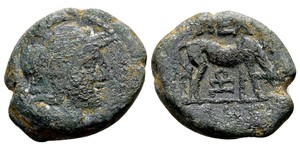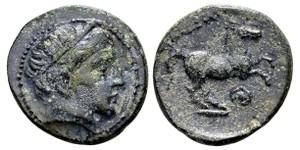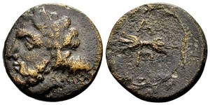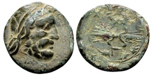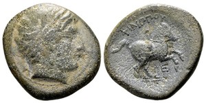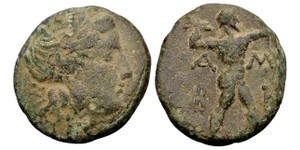 Ca. 238-168 BC. Æs, 7.13 gr. Head of Apollo with laurelwreath / AM-BR Zeus striding right with thunderbolt and Aegis. SN ...