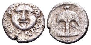 Mid-late 4th century BC. AR drachm, 2.76 g. Facing gorgoneion / Anchor; A to left, crayfish to right. SNG Cop. 456. Near ...