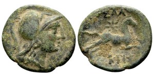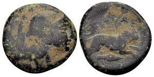 Pseudo-autonomous, ca. 187-31 BC. Æ18, 3.9 g. Helmeted head of Athena right / ΘΕΣΣΑΛΟ [ΝΙ]ΚΗΣ horse galloping right; abo ...