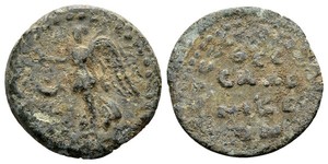 Temp. Domitian, ca. 81-96 AD. Æ15, 2.48 g. Nike left, holding wreath / ΘEC CAΛO NIKE ΩN in four lines, within wreath. RP ...