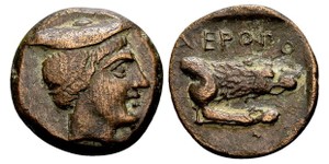 398/7-395/4 BC. Æ chalkous, 2.01 g. Male head wearing petasos right / [Α]ΕΡΟΠΟ forepart of lion right. SNG Alpha Bank 17 ...
