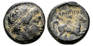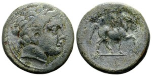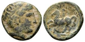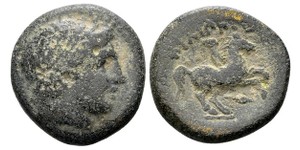 Uncertain mint in Macedon, 315-295 BC. Æ18, 6.46 g. Head of Apollo rightt / ΦIΛIΠΠOY youth on horseback right; below: th ...
