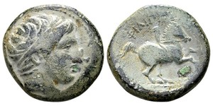 Uncertain mint in Macedon, 315-295 BC. Æ19, 6.91 g. Head of Apollo right; behind: A / ΦIΛIΠΠOY youth on horseback right; ...