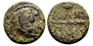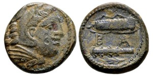 Ca. 183-31 B.C. Æ17, 5.60 g. Head of young Herakles right, wearing lion's skin headdress / ΘEΣΣAΛO NIKEΩN club [within o ...
