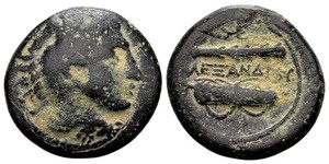 Uncertain mint in Macedon, 336-323 BC. Æ17, 7.43 g. Head of young Herakles right, wearing lion skin / ΑΛEΞΑΝΔΡΟΥ bow, q ...