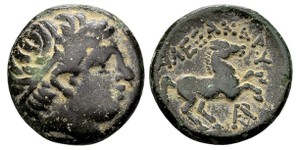 Uncertain mint in Macedon, 315-295 BC. Æ18, 7.86 g. Head of Apollo left / ΦIΛIΠΠOY youth on horseback left; below: lions ...