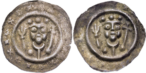 Friedrich II. 1215-1250, Brakteat o.J. (1215/35). Gekrönter Kopf von vorne zwischen Lindenzweig und Turm.