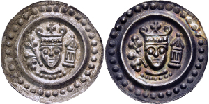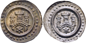 Anonym. 1268-1300, Brakteat o.J. (um 1276). Dreitürmige Torburg, im Tor Stern.