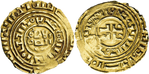 Bezant o.J. (um 1187/1260; 3. Phase) Imitation eines fatimidischen Gold-Dinars des Kalifen Al-Amir. Beiderseits zwei Zei ...