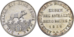 Alexander Carl. 1834-1863, Berlin.Taler 1855 A Ausbringen der anhaltischen Gruben (vz). Dazu 1/6 Taler 1861 A (vz-St).