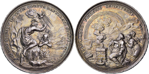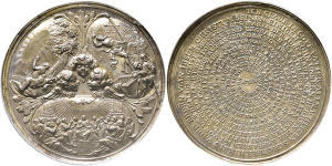 Medaille o.J. (um 1700; unsigniert, von Philipp Heinrich Müller) auf das christliche Glaubensbekenntnis. 3 Medaillons mi ...