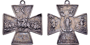 Ulrichskreuz o.J. (18. Jh.; unsigniert). Ungarnschlacht. Rs: Dreifaltigkeit über St. Benedict zwischen St. Ulrich und de ...