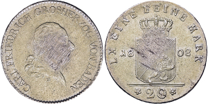 Karl Friedrich. 1738-1803, Mannheim.20 Konventionskreuzer 1808 B (Stempel von Hans Heinrich Boltshauser). Stutzmann 52a. ...