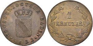 Ludwig Wilhelm August. 1818-1830, Mannheim.1 Cu-Kreuzer 1822 (ohne Mmz.). Gekröntes Wappen. Rs: Wert in Lorbeerzweigen. ...