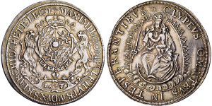 Maximilian I. 1623-1651, München.Breiter Reichstaler 1627 (im Stempel aus 1626 geändert mit großer 7). MAXIMIL . COM . P ...