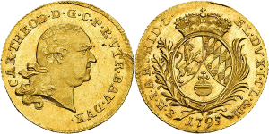 Karl Theodor. 1777-1799, München.Dukat 1795 (unsigniert). CAR . THEOD . D . G . C . P . R . VTR . BAV . DVX . Bloße Büst ...