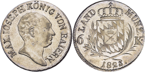 Maximilian I. Joseph. 1806-1825, München.6 Kreuzer 1825 (vz-St). Dazu Ludwig I. Gulden 1841 (ss); 1/2 Gulden 1845 (fast ...