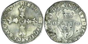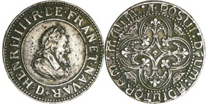 A/ + HENRICVS. IIII. D. G. [FRAN. ET. NA]VA. REX Buste lauré et cuirassé à droite, au col plat. Lettre d'atelier sous le ...