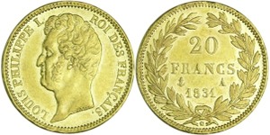 Lot 039/732 MODERN FRENCH COINS - Louis XVIII to Louis-Philippe :: France - Louis-Philippe Ier (1830-1848) - 20 francs tête nue tranche en relief 1831 A (Paris)