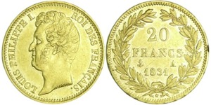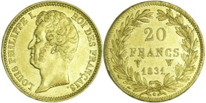 Lot 039/733 MODERN FRENCH COINS - Louis XVIII to Louis-Philippe :: France - Louis-Philippe Ier (1830-1848) - 20 francs tête nue tranche en relief 1831 W (Lille)