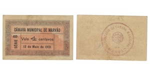 PAPEL. Câmara Municipal. 4 Centavos 12 Mai 1921. Série B. Uniface. Carimbo no verso. ESCASSA. 8x5 cm. CMA 2603. MBC. ...