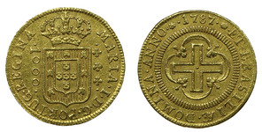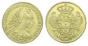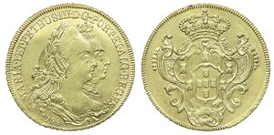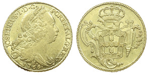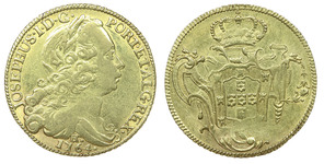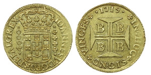 AU. Dobra 1731. Minas Gerais. 1/0 data emendada. 28,35 g. Gomes 140.09, KM 139, AR O287, B 105.10. MBC+ ...