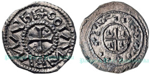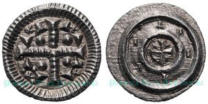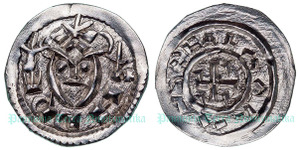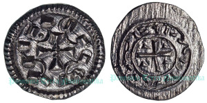 Coloman (1095-1116), denár EK: 9/9 C.I.:- H.:- ÉH:- Ag 0,39 g Változat publikálva: PTN/33. aukció No 45. Hátlapi körirat ...