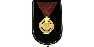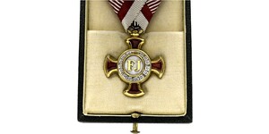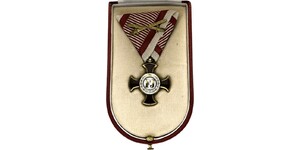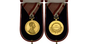 Jubiläumskreuz 1848-1908; Bronze vergoldet, mit rotem Orig.Band; im Lederetui mit Goldrand, schwarzes Inlay, weißer Himm ...