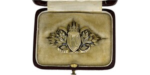 Geschenkbrosche Kaiser Karl I. 1914-1917; AR vergoldet, Löwenkopfpunze und Herstellermarke FK; VS mit Monogramm und 8 bl ...