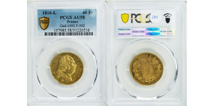 France. Louis XVIII (1814 - 1824). 40 Francs 1816-L. PCGS AU58. Bayonne. Mintage: 3,258 pieces only. Only 4 ex. graded h ...