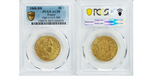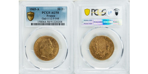 France. Napoleon III (1852 - 1870). 50 Francs 1865-A. PCGS AU58. Paris. Mintage: 3,740 pieces. KM-804; Gad-1112 Gold. 28 ...