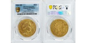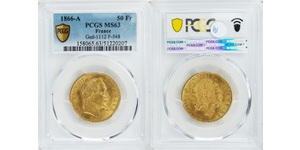 France. Napoleon III (1852 - 1870). 50 Francs 1866-A. PCGS MS63. Paris. KM-804; Gad-1112 Gold. 28 mm. 16.13 gr. (900‰). ...