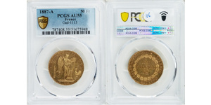 France. Third Republic (1870 - 1940). 50 Francs Génie 1887-A. PCGS AU55. Paris. Mintage: 301 pieces only. KM-831; Gad-11 ...