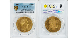 France. Napoleon III (1852 - 1870). 100 Francs 1856-A. PCGS AU55. Paris. KM-786; Gad-1135 Gold. 35 mm. 32.26 gr. (900‰). ...