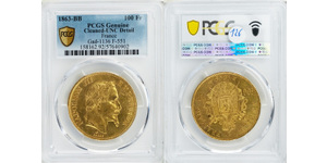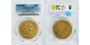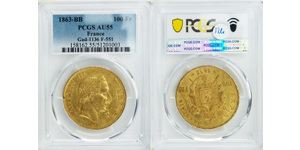 (1852 - 1870). 100 Francs 1863-BB. PCGS AU58. Strasbourg. Mintage: 5,078 pieces. KM-802; Gad-1136 Gold. 35 mm. 32.26 gr ...