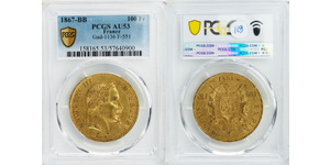 France. Napoleon III (1852 - 1870). 100 Francs 1867-A. PCGS AU55. Paris. Mintage: 4,309. KM-802; Gad-1136 Gold. 35 mm. 3 ...