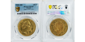 France. Napoleon III (1852 - 1870). 100 Francs 1868-BB. PCGS XF45. Strasbourg. Mintage: 789 pieces only. KM-802; Gad-11 ...