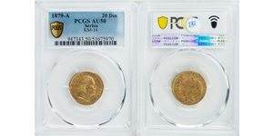 Serbia. Milan IV (1868 - 1882). 20 Dinari 1879-A. PCGS AU50. Paris. One year type. KM-14 Gold. 21 mm. 6.45 gr. (900‰). ...